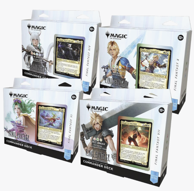 • 4 Magic: The Gathering—FINAL FANTASY Commander Deck: Collector’s Edition (FINAL FANTASY VI, FINAL FANTASY VII, FINAL FANTASY X, and FINAL FANTASY XIV); each Commander Deck contains: