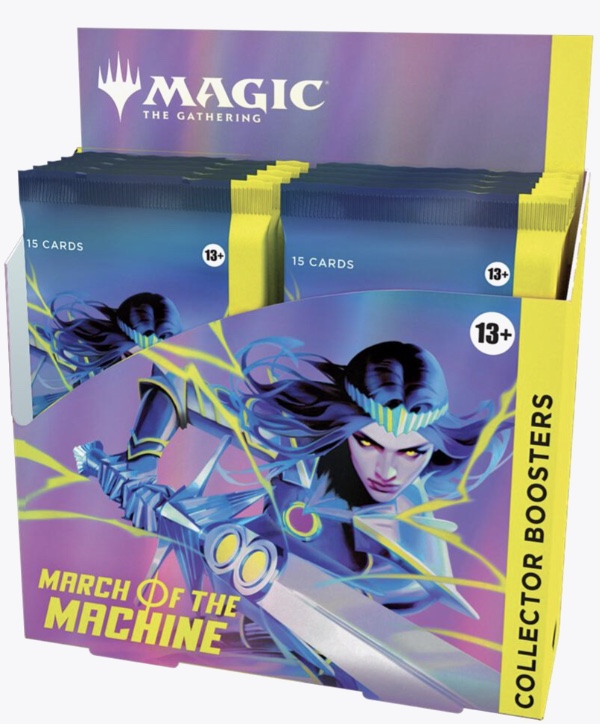 The March of the Machine Collector Booster Box contains 12 March of the Machine Collector Boosters. Each Collector Booster contains 15 Magic: The Gathering cards and 1 Traditional Foil double-sided token, with a combination of 5 cards of rarity Rare or higher and 4 Uncommon, 5 Common, and 1 Land cards. Every pack contains a total of 10–12 Traditional Foil cards.